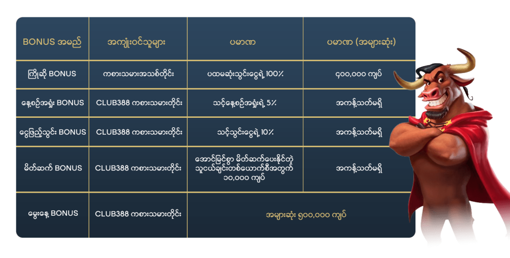 Online ကာစီနိုတိုင်းမှာ Bonus တွေဟာ အရေးပါတဲ့ အစိတ်အပိုင်းဖြစ်ပြီး Club388 လည်း ဒီနေရာမှာ ချွင်းချက်မရှိပါဘူး။ အောက်ပါဇယားကိုကြည့်ပြီး လူတိုင်းအတွက် ရရှိနိုင်တဲ့ Bonus အမျိုးအစားတွေကို လေ့လာကြည့်ပါ။